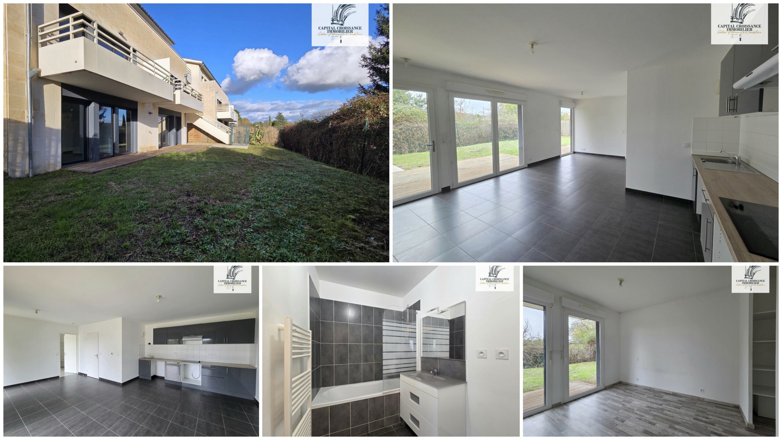 - Appartement T2 de 47,50 m² avec spacieuse terrasse bois et jardin de 100 m² orienté Sud.